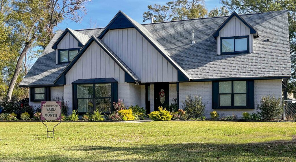 Hybrid gardenias border the driveway and front of the home, with a bed of white roses surrounding the mailbox. Pink knockout roses add a pop of color to the neatly landscaped yard.